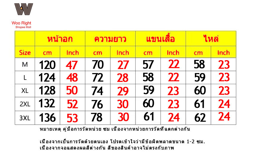 3XL: ช่วงน้ำหนักที่แนะนำ 69 ~ 74 กิโลกรัม