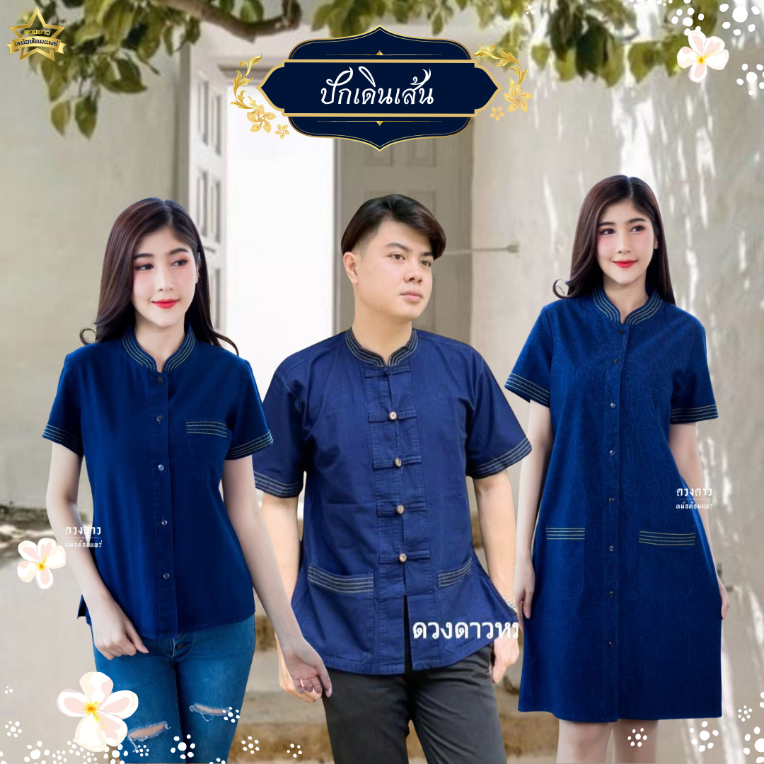 [ดวงดาวหม้อห้อมแพร่] เดรสหม้อห้อมคอจีนเข้ารูป/เดรสทางเอ ปักเดินเส้น รอบอก 34-56 นิ้ว